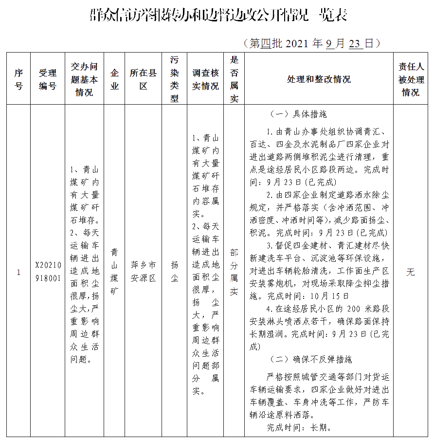 关于省环保督察信访件反映青山煤矿有关问题公示