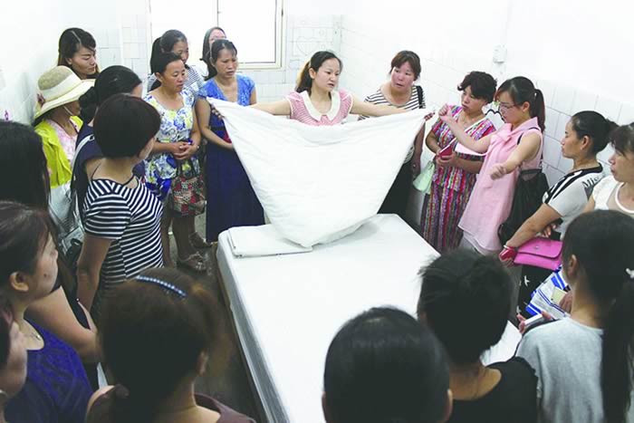 图为转岗分流人员培训现场,授课教师钟燕林正在传授保洁技能。