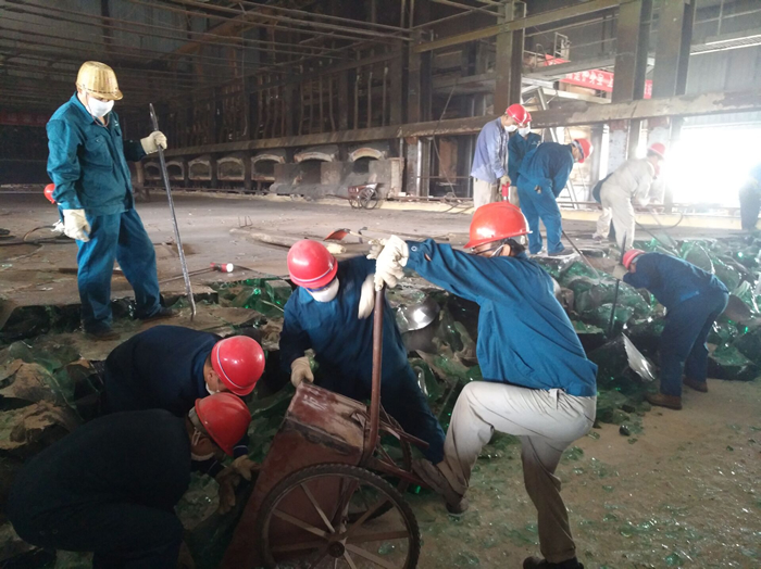 图为浮玻厂职工正在拆除玻璃熔窑。