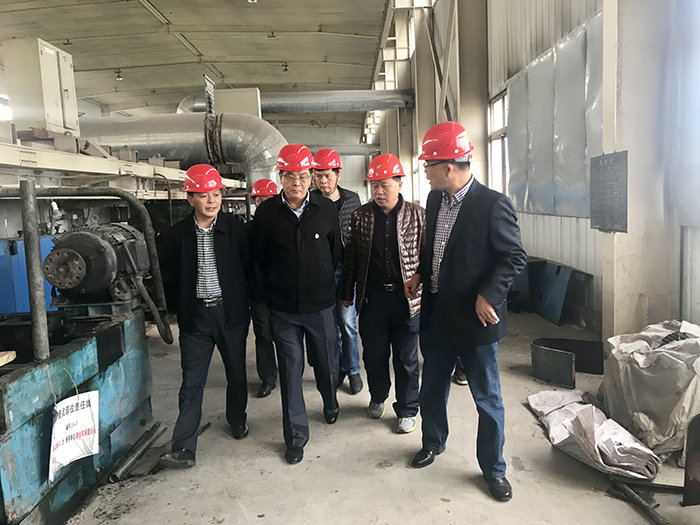 图为曾昭和(左二)在浮法玻璃厂实地调研。