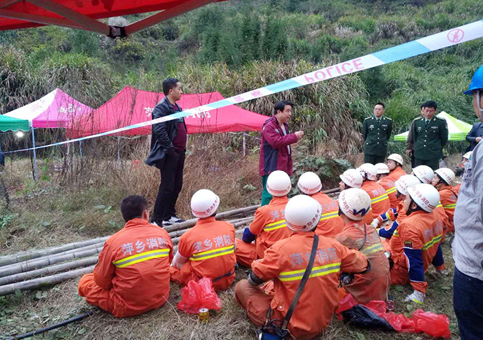 11月28日上午,湘雅萍矿合作医院接到萍乡市卫计委指示:湘东区荷尧镇一未开发的地下溶洞有被困人员,需要灾难应急医学救援队立即前去支援。该院应急救援队成员孙亚斌、肖饶军、江丽和倪坚组成的救援小组带齐急救药品及物品迅速出发。 加入医疗救援的还有湘东区人民医院、湘东区中医院、赣西医院及荷尧卫生院的救援人员。湘雅萍矿合作医院是萍乡市医学会灾难医学分会主委单位,多次参与矿难救援、房屋坍塌救援,积累了丰富的灾难医疗应急救援经验,此次被卫计委指派参与救援也肩负着对基层医院进行医疗救援指导的任务。 救援现场,公安、消防、矿山救护、安监、水务、供电、医疗等部门正有条不紊地开展工作。湘雅萍矿合作医院医疗救援队一到现场就忙碌起来,迅速布置好医疗救援区,时刻准备救治伤者。