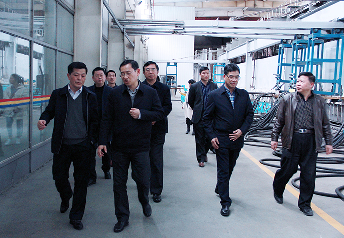 图为江明成(左二)一行在生产车间实地调研。周建生 摄