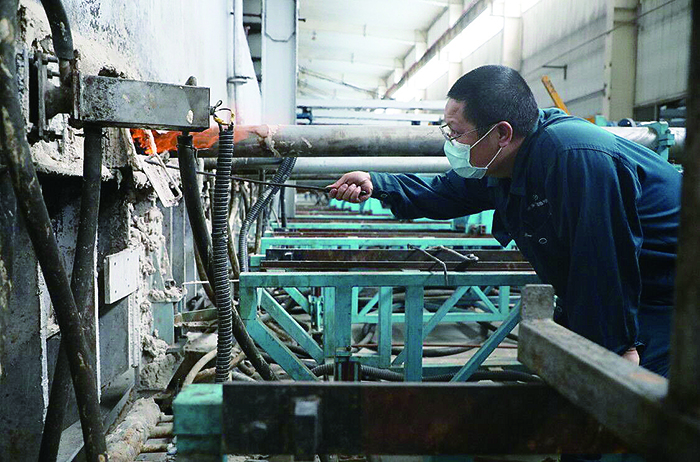 坚毅——热浪扑面而来,高温炙烤全身。在浮法玻璃厂,职工们用坚韧不拔的毅力抵抗高温的侵蚀,汗水打湿了他们一件又一件衣服,脸被烤得通红,他们却从不退缩。一块块玻璃在他们的努力下,被制作出来送往千家万户,为人们遮风挡雨。他们是坚毅的浮玻人,他们为奋斗而生。图为锡槽工观察窑内火焰状况。