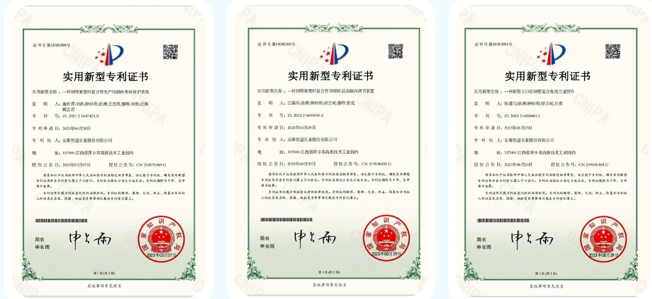 近日,安源管道华亿首页(中国)网页版申报的《一种钢骨架塑料复合管生产线钢丝堆丝保护系统》《一种新型大口径钢塑复合电熔三通管件》《一种钢骨架塑料复合管用焊轮总成轴向调节装置》3项实用新型专利获得国家知识产权局授权。