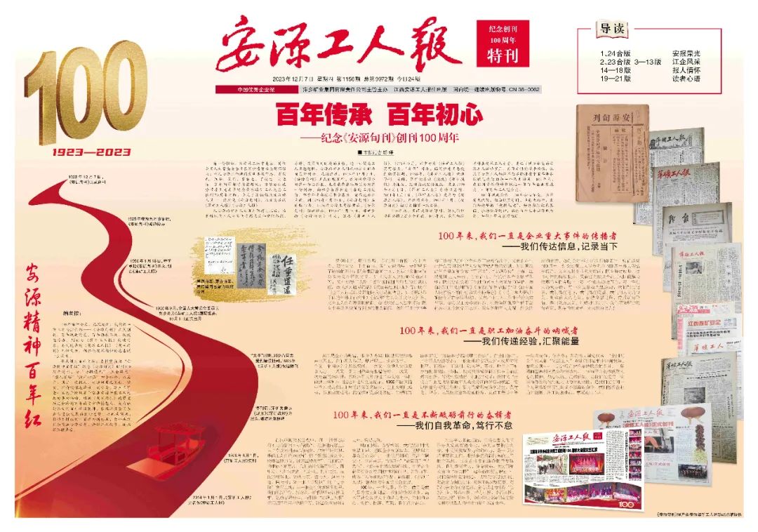 值此创刊百年之际,《安源工人报》推出“安源精神百年红”纪念《安源旬刊》创刊100周年特刊,分“安报荣光”“江企风采”“报人情怀”“读者心语”四个部分24个版面,以记者、读者、通讯员、老报人之笔触、镜头,深情缅怀毛泽东、刘少奇、李立三等老一辈无产阶级革命家在安源开展工人运动的丰功伟绩,回顾《安源旬刊》的厚重历史和跨越百年的文化传播魅力,大力弘扬伟大的百年安源精神,展现江投集团各企业蓬勃发展的良好态势。