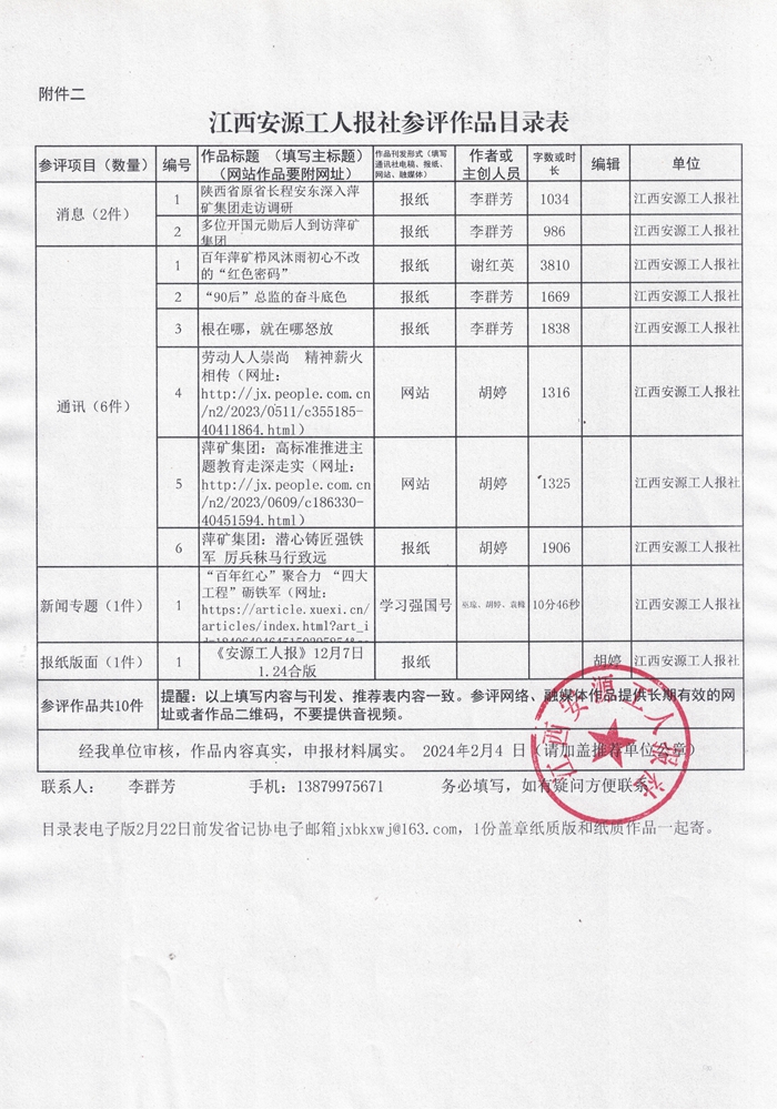 按照《第二十六届江西报刊网络新闻奖报送作品的预通知》要求,江西安源工人报社迅速组织推荐参评作品,经编辑记者自荐、评委会初评,现将拟推荐参评的10件作品(见附件)进行公示。公示时间:2024年2月8日—2月21日,如有意见可向江西安源工人报社反映。联系电话:0799-6582416。
