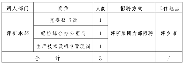 因工作需要,我司招聘党委秘书岗、纪检综合办公室岗、生产技术及机电管理岗各1人,现将有关事项公告如下: 一、招聘岗位及人数、范围