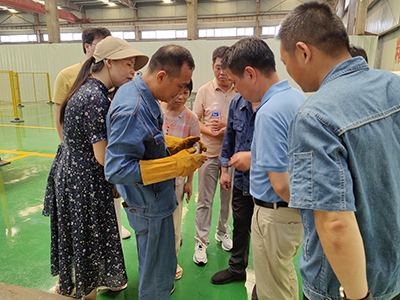 调研组一行还现场观摩了该厂名师代表、技能强者的各项技能展示。首先开始的是该厂玻璃生产最具代表性的“拉边机压板操作”演示,只见技师肖亮先是精准无误地调节好拉边机速度,随即缓慢均匀进行机杠深入长度调节,最后再调节拉边机的压入深度,尽管工艺要求为误差不超过10mm,但操作人员做到的却是丝毫不差。“正是因为我们每次精准的操作才保障了玻璃带的平稳运行,有效提高了玻璃的产质量。”肖亮介绍道。接下来的“无模板配钥匙”,只见技师宋亮只是简单看了一眼原装钥匙便清晰地将各齿齿距、点位、深度铭记于心,随即便拿起锉刀熟练打磨起来,尽管现场操作只有短短1分多钟,但这却凝结了他三十年如一日对技术的严格要求与刻苦钻研。高级技师严波展示的“不锈钢角焊360°一次成型”,双手左右配合、一气呵成,不一会儿一条完美无瑕的焊接弧线就呈现在了大家眼前,现场瞬时响起阵阵掌声。大家纷纷被现场技术人员心如细丝、手稳如山、精益求精的表现所震撼、折服。