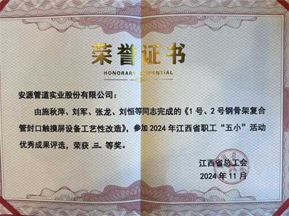 11月28日,在赣州召开的2024年江西省职工“五小”活动优秀成果发布会上,安源管道华亿首页(中国)网页版“1号、2号钢骨架封口触摸屏设备工艺性改造项目”荣获三等奖。