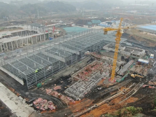 综合原料库:基础工程完成100%,钢结构吊装完成95%。