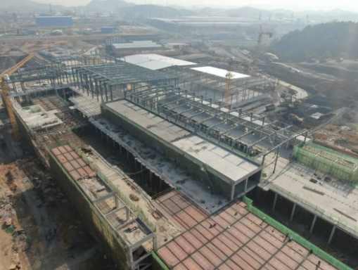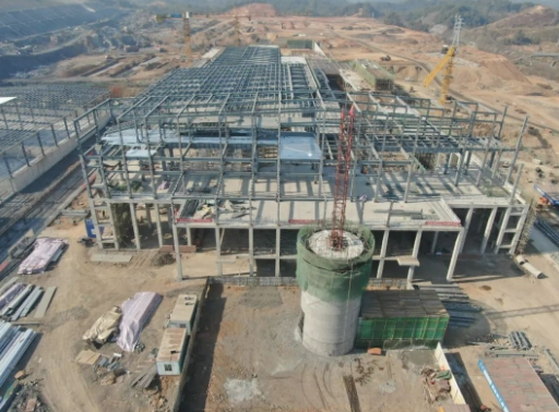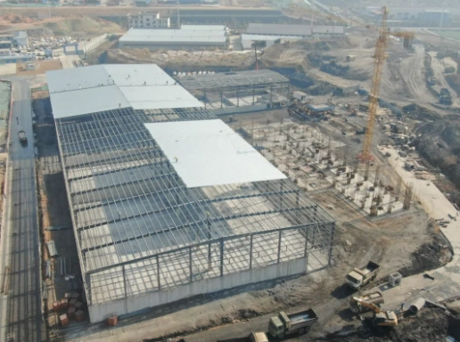 综合原料库:基础工程完成100%,钢结构吊装完成100%,地坪工程完成78%。 原料车间:基础工程完成100%。