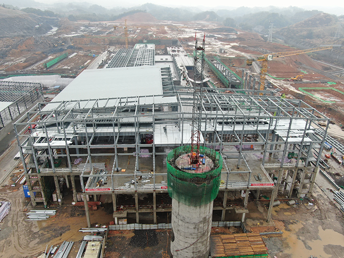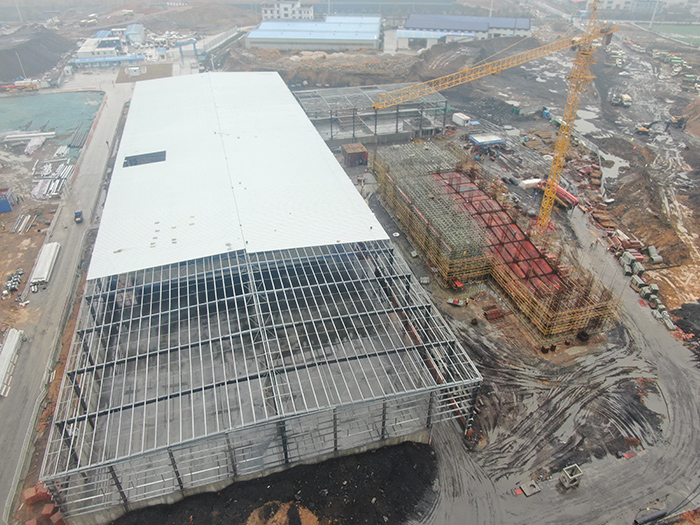 综合原料库:基础工程完成,钢结构吊装完成90%,地坪工程完成90%。 原料车间:基础工程完成,主体工程完成16%。