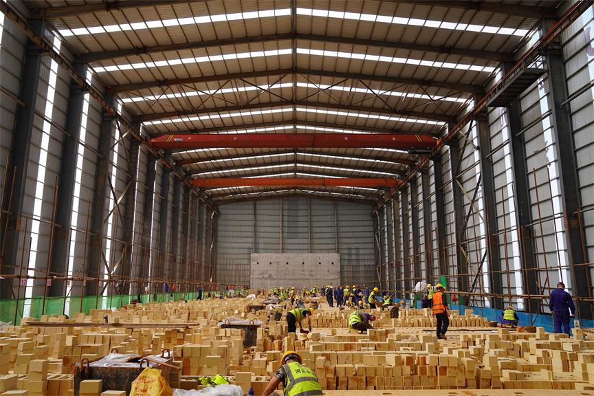 据了解,砌筑斜道是焦炉施工中最为复杂的环节。这里使用的耐火砖不仅重量大,有的重达100多公斤,而且型号多,对施工技术有着极高的要求。为确保工程质量,施工团队精心组织,安排69人负责砌筑、35人专门备料,同时还有69人在旁实时监测。施工过程严格遵循“砌筑一块、检测一块、浇筑一块”的标准,做到层层验收把关。整座焦炉计划用砖2.6万多吨,目前已完成1.4万吨用砖量。为追赶进度,施工人员充分利用晴好天气,每天6:15召开晨会,6:30准时开工。他们立下“军令状”,不完成当天任务绝不收工,有时甚至要忙碌到晚上10点。凭借着这股团结拼搏劲,他们成功抢回了之前耽误的7天时间。