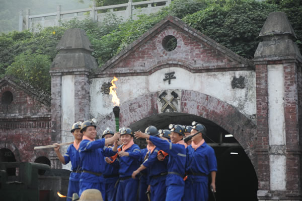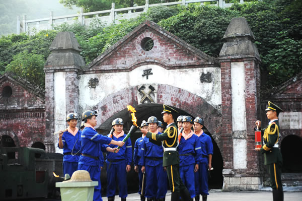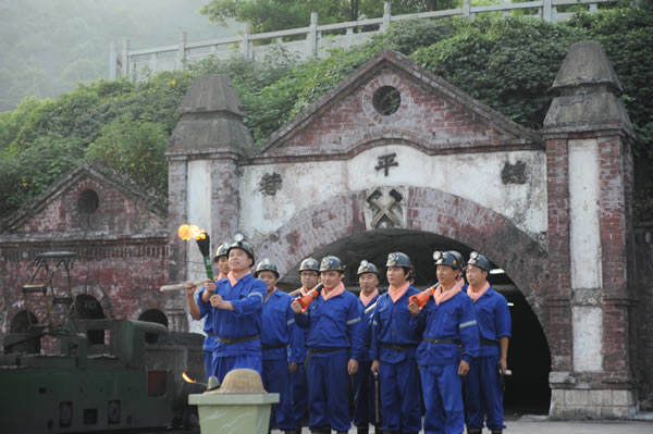安源煤矿井口总平巷上铁锤、岩尖辉映着灿烂晨光。8月22日清晨,第七届全国城市运动会第四颗火种——“工运曙光之火”,在“中国工人运动的摇篮”——安源成功采集。