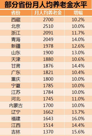 从增幅看,这18个省份月人均养老金水平的增幅均在国家规定的增幅(10%左右)以上,其中,福建增幅最高,为16%左右。